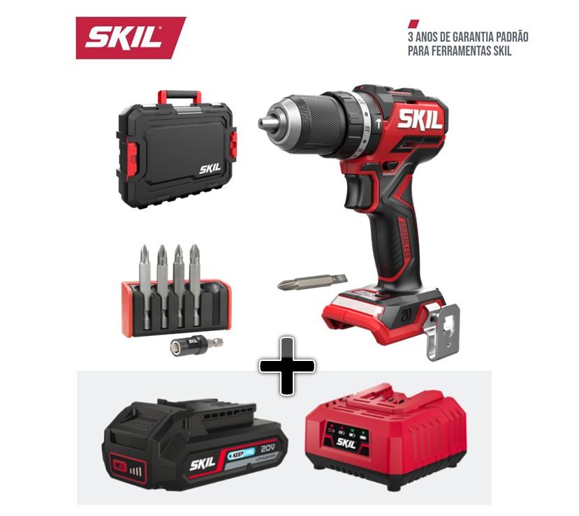A SKIL 3075 JA é fornecida numa mala de transporte com um jogo de 6 pontas de aparafusamento, uma ponta de aparafusamento dupla e um clipe de fixação ao cinto, traz 1 bateria de 2.5Ah e um carregador