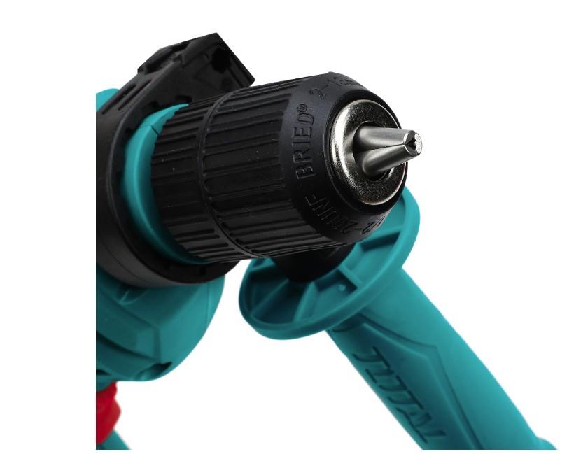 O robusto mandril de liberação rápida de 13 milímetros contém os acessórios desejados (mandril de 1,5 a 13 milímetros) e o batente de profundidade de perfuração permite um trabalho preciso.